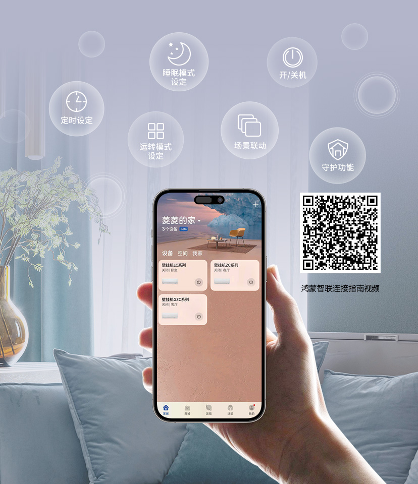 菱之洁Plus系列可使用智慧生活APP进行控制,手机上即可开关空调,不受地点限制,舒适由您掌控。
